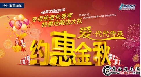 2014年海馬汽車大型服務(wù)活動(dòng)金秋之旅于9月30日?qǐng)A滿結(jié)束。今年的活動(dòng)主題為“約‘惠’金秋,愛(ài)•代代傳承”,五大優(yōu)惠政策回饋廣大海馬車主。福美來(lái)M5車主參與同期舉辦的“愛(ài)•代代傳承”公益、親子類活動(dòng),在金秋十月來(lái)臨之際,帶“愛(ài)”回家。