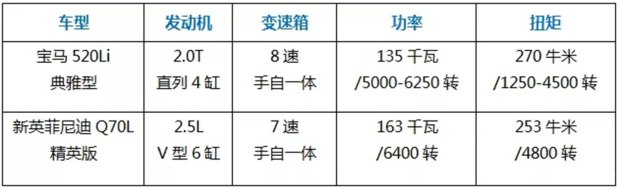 我們拿寶馬5系和新英菲尼迪Q70L的入門車型進(jìn)行對(duì)比,先看數(shù)據(jù):