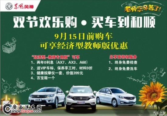 雙節(jié)歡樂購,暢享在風(fēng)神,東風(fēng)風(fēng)神南寧和順專營店推出--教師節(jié)優(yōu)惠購車月&禮獻中秋傾情回饋;活動期間,特別推出“經(jīng)濟型-教師專用版”;